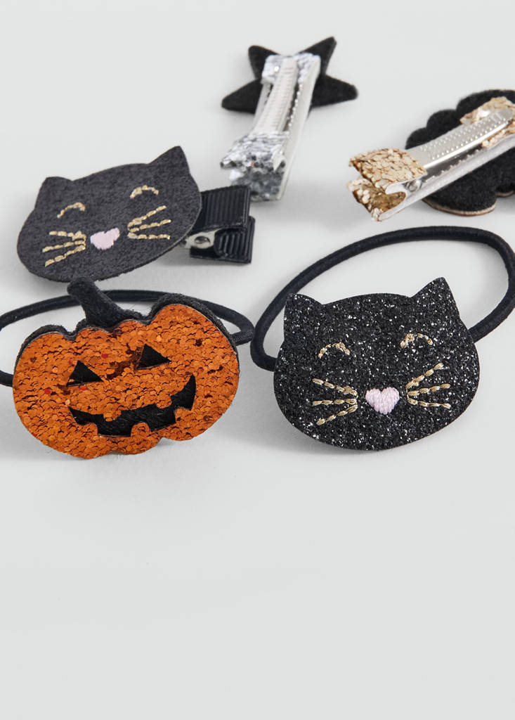 Pack of halloween scrunchies and hairclips. Glitter detail. Halloween Collection. Carnival collection