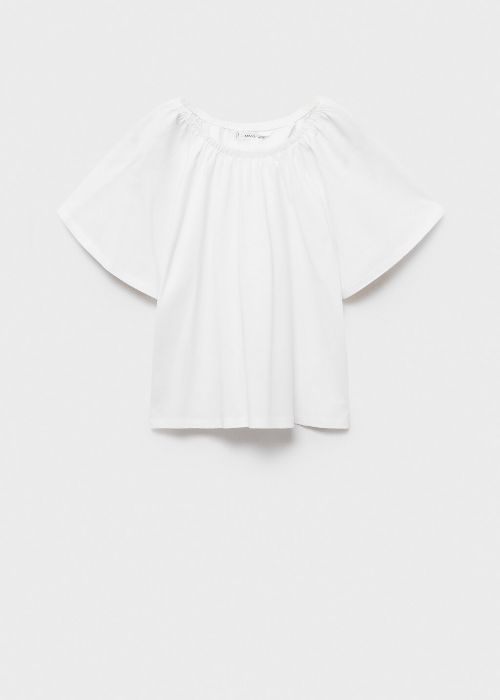 100% cotton fabric. Standard design. Straight design. Short raglan sleeve. Ruffle-effect sleeve. Elasticated boat neck. Crossover back.