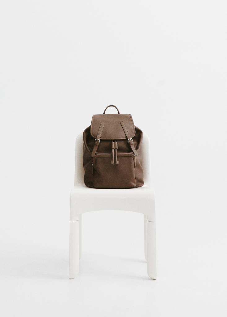 Nappa faux-leather. Main compartment with double buckle closure. Adjustable drawstring closure. Medium embossed pocket with zip closure. Magnetic fastening on the front. Secondary electronic device compartment with Velcro adjustment and concealed zip closure. Handle made of the same fabric. Padded backrest and handles for added comfort. Adjustable shoulder straps