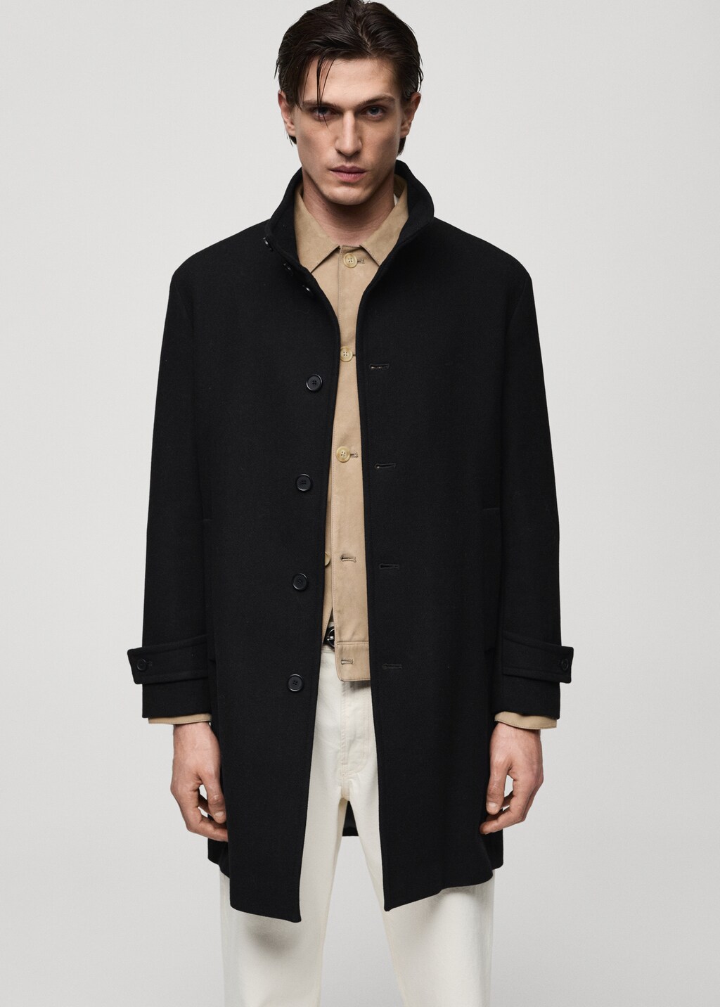 Straight Design. Straight Silhouette. Medium Length. Recycled wool mix fabric. Button-down collar with button closure. Button fastening at the front. Two front welt pockets. Long sleeves with buttoned strip cuffs. Long design. Straight hem. Inner lining. Medium design.