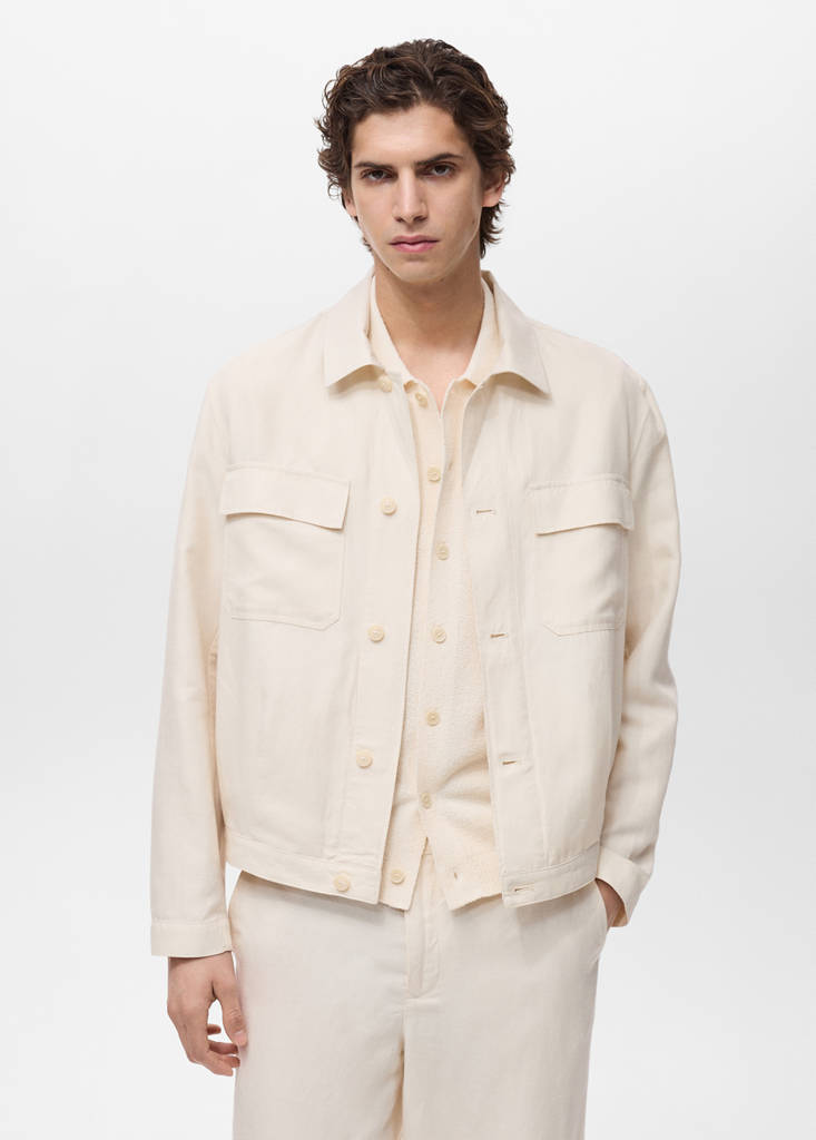 Linen and lyocell blend fabric. Straight-fit. Bowling collar. Two patch pockets with flaps on the chest. Front closure with buttons. Front and back pleat detail at the hem. Buttoned cuffs