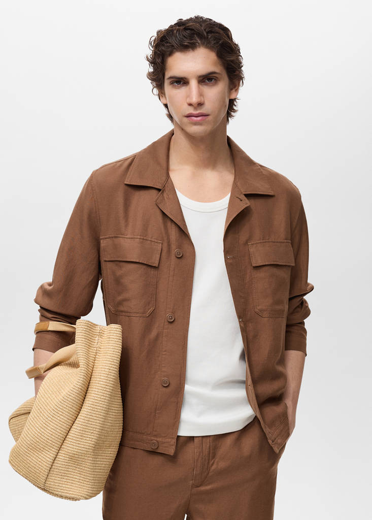 Linen and lyocell blend fabric. Straight-fit. Bowling collar. Two patch pockets with flaps on the chest. Front closure with buttons. Front and back pleat detail at the hem. Buttoned cuffs