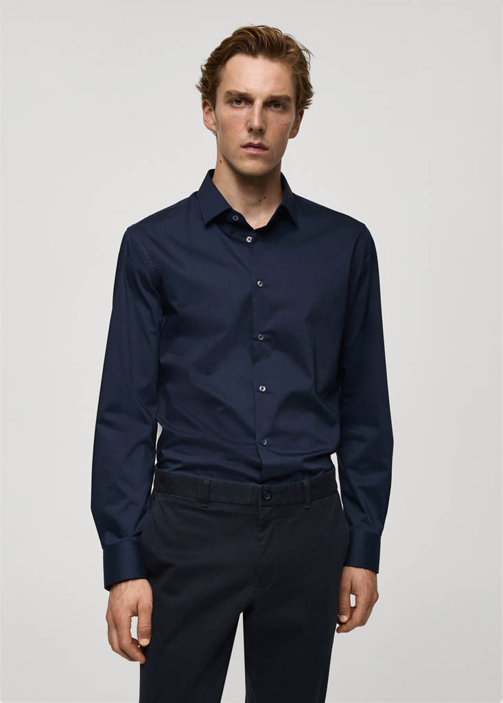 The colour brown is exclusive online. Regular fit. Slightly elastic cotton fabric. Long sleeves with buttoned cuffs. Classic collar. Front closure with buttons. Rounded base