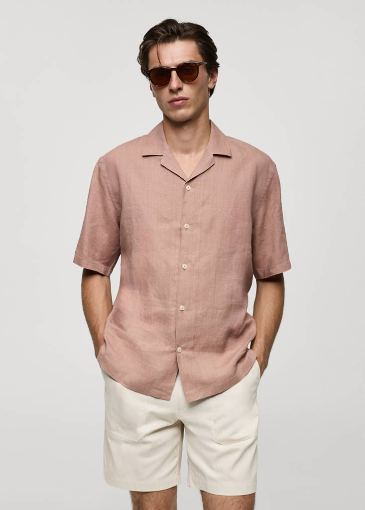 Regular fit. 100% linen fabric. Bowling collar. Button fastening at the front. Short sleeves. Straight hem