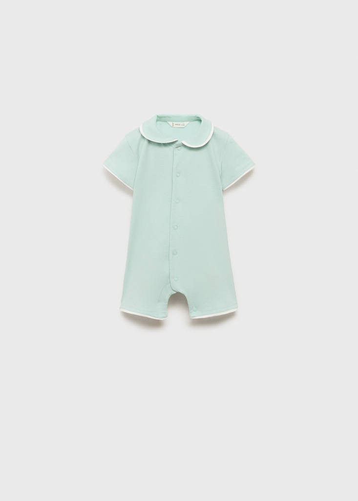 Cotton fabric. Short design. Straight design. Babydoll collar. Short sleeves. Front closure with buttons. Press-stud fastening. Contrasting trim finish