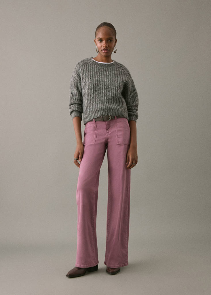 Cotton fabric. Stretch fabric. Long design. Straight design. Regular Waist. Belt loops. Zip and button fastening. Two front patch pockets. Two patch pockets at the back. Embroidered stars