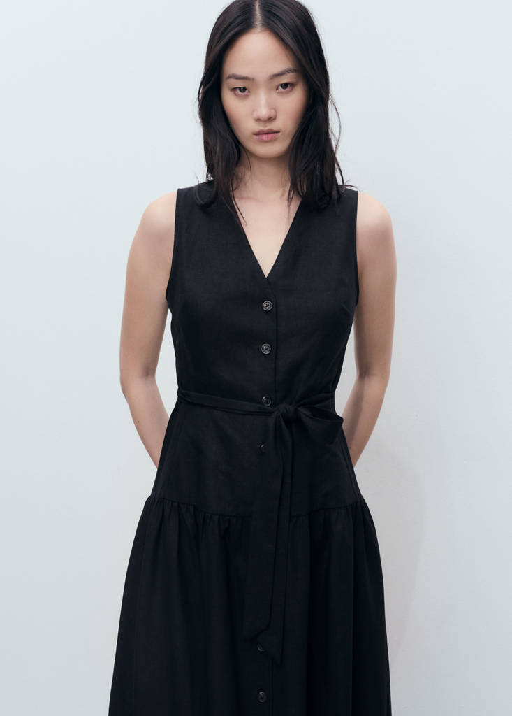 Linen mix. Midi design. A-line design. V-neck. Sleeveless. Wide straps. Belt loops. Removable belt. Front closure with buttons. Available Plus