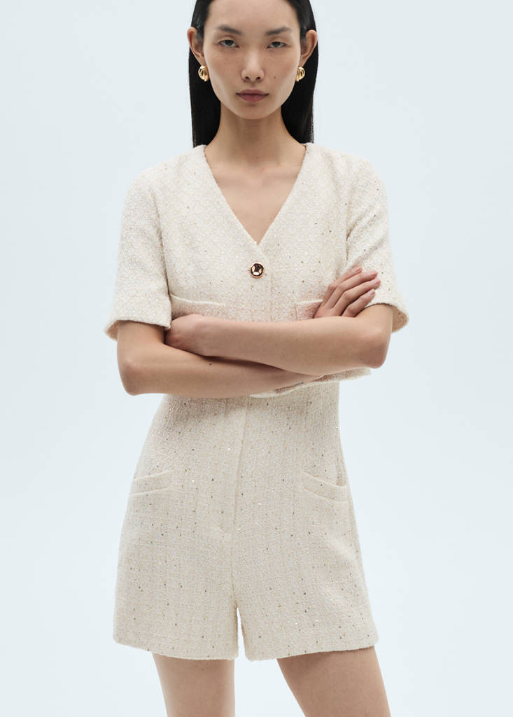 Tweed fabric. Straight design. Short design. V-neck. Short sleeves. Two front welt pockets. Two patch pockets on the chest. Button fastening at the front. Inner lining. This garment belongs to our event collection, designed to make you the perfect guest at any party, wedding or ceremony