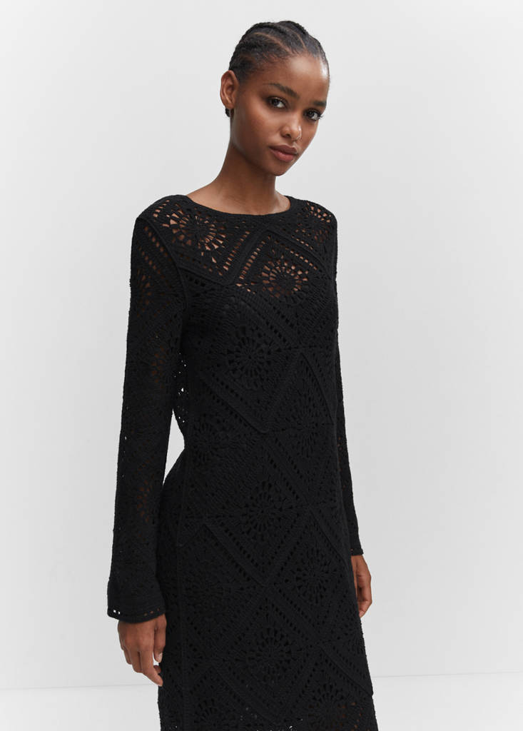 Crochet fabric, cotton-blend fabric, evasé design, long design, geometric design, rounded neck, long flared sleeve, keyhole detail on the back with button fastening, inner lining.