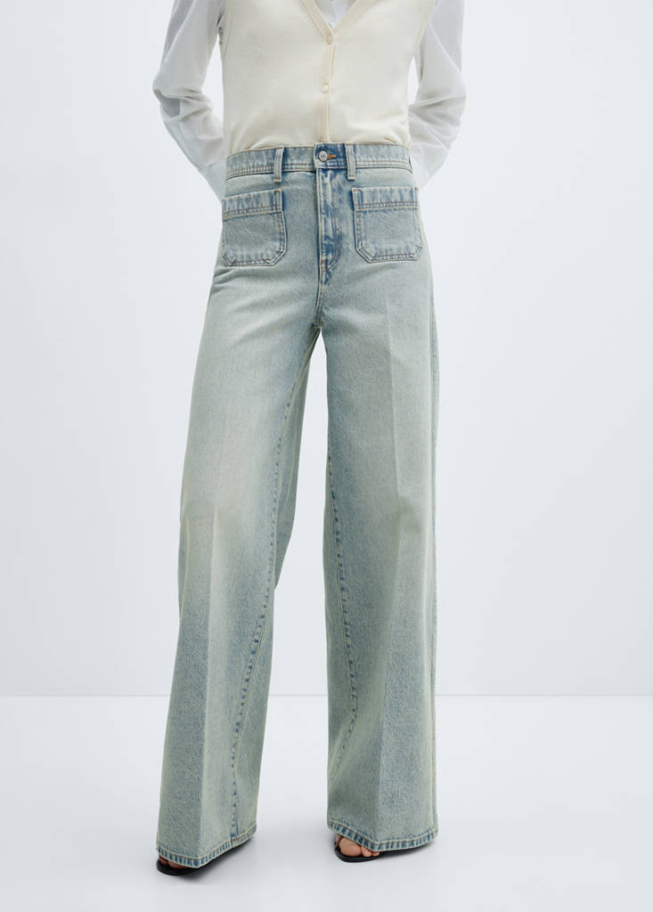 Denim-style cotton fabric. Long design. Wide-leg design. High waist. Belt loops. Two patch pockets at the front. Two patch pockets at the back. Zip and button fastening. Interior length 87.5 cm