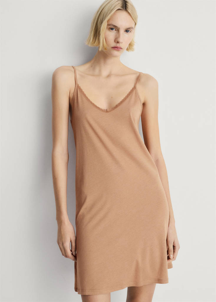 Nightgown. Cotton and modal mix. Pleasant texture. Contrasting lace trims. V-neck. Thin straps. Provides comfort and freedom of movement. Available in different colours