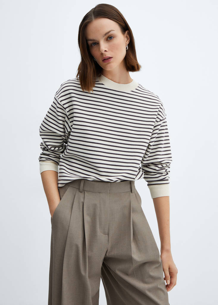 Țesătură amestec de bumbac. Design drept. Guler rotund. Mâneci lungi cu manșete elastice. Fără sistem de închidere. Cusătură umăr căzută. Capete striații contrastante. Model cu dungi