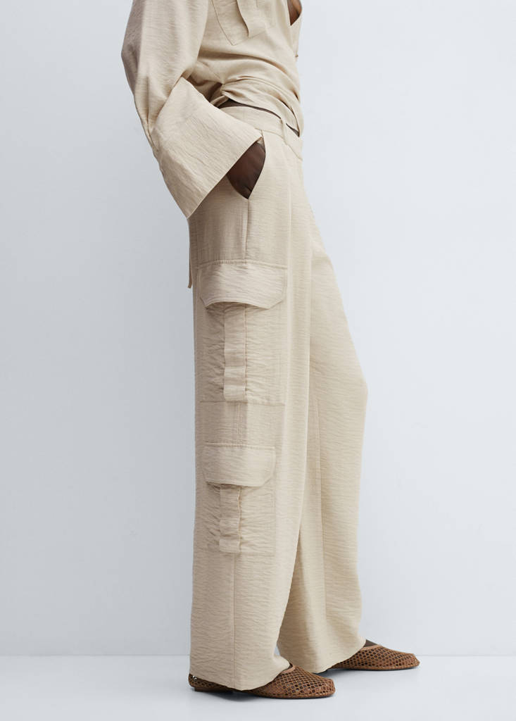 Material fluid. Țesătură texturată. Design lung. Model cargo. Talie medie. Gaici pentru curea. Două buzunare laterale. Patru buzunare cu clapă în față. Două buzunare cu refilet la spate. Închidere ascunsă cu nasture, gaică și fermoar. Detaliu pliuri. Total look