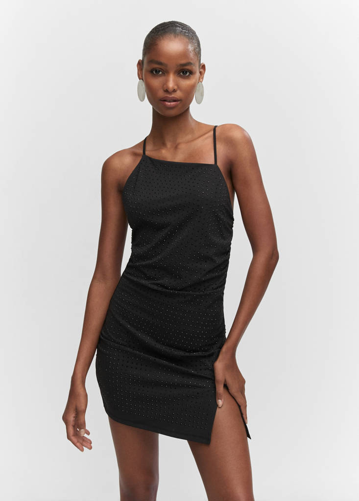Țesătură elastică. Design asimetric. Design scurt. Guler asimetric. Bretele subțiri. Spate cu decolteu. Fără sistem de închidere. Detaliu ștras. Șliț lateral. Sezonul festivalurilor. Colecție pentru petreceri, ceremonii și comuniuni. Design cambrat