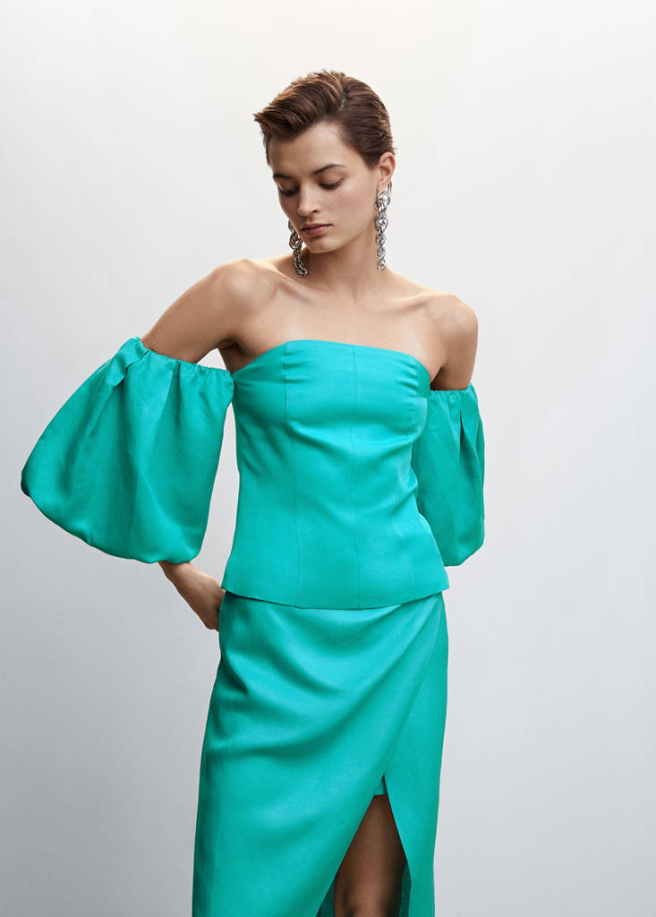 Țesătură vaporoasă. Model crop. Stil corset. Fără bretele. Mânecă scurtă bufantă. Închidere cu fermoar în spate. Total look. Colecția pentru sărbători și ceremonii