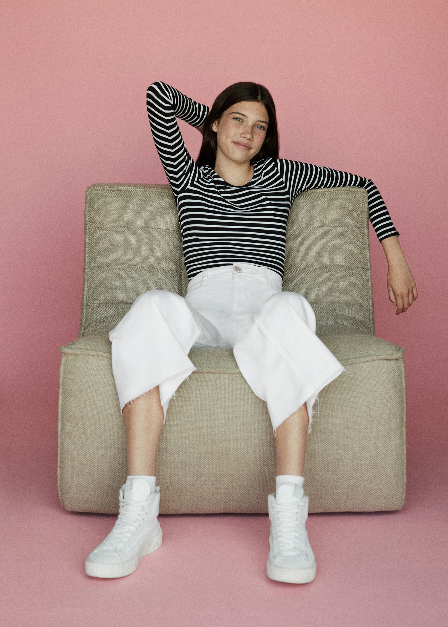 Denim style cotton fabric. Sustainable cotton. Wide-leg design. Seamless. Cropped design. High waist. Loops. Two patch pockets on the back. Zip and one button fastening. This item may only be returned by post. Teen collection.