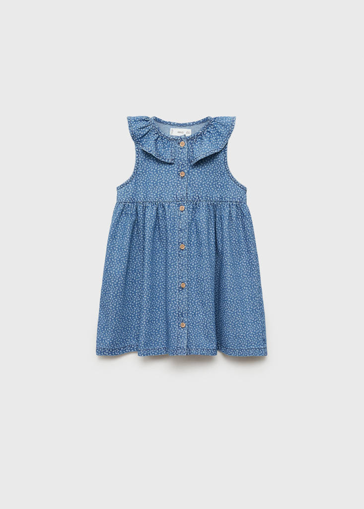 Denim-style cotton fabric. Straight design. Short design. Floral design. Wood effect buttons. Gathered Waist. Babydoll collar. Sleeveless. Front button closure