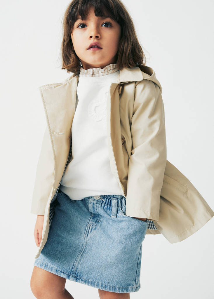 Denim-style cotton fabric. Short design. Paperbag. Elastic paperbag waistband. Two patch pockets at the back. Elasticated waistband. Front closure. Button closure. One press stud fastening. Summer camp
