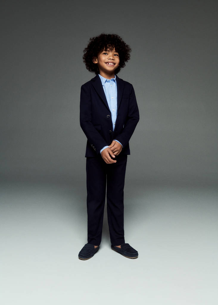 Party, ceremony and communion collection. Slim fit. Peak lapel. Long sleeves. Notch lapels and buttonhole. Chest welt pocket. Two patch pockets at the front. Long sleeves with buttoned cuffs. Front closure with buttons