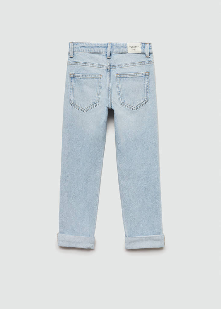 Back to school collection. Denim-style cotton fabric. Straight design. Long design. Mid-rise. Five pockets. Rolled-up hem. Zip and button fastening
