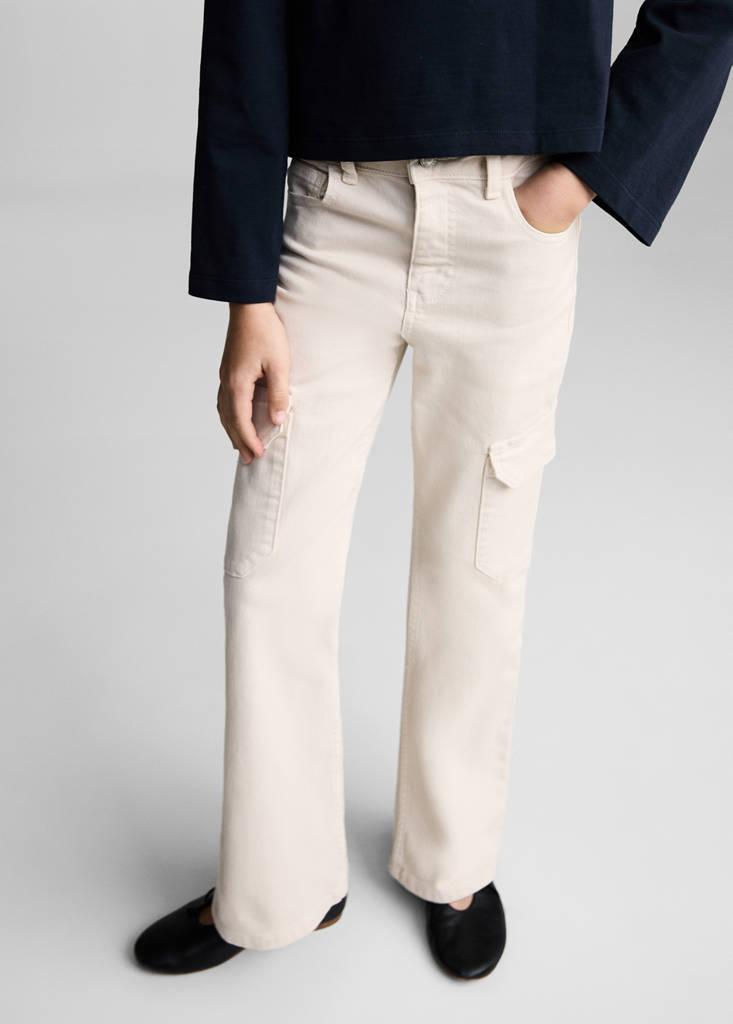 Denim-style cotton fabric. Flare design. Two cargo pockets. Ticket pocket. Two front pockets. Two patch pockets at the back. Belt loops. Zip and button fastening