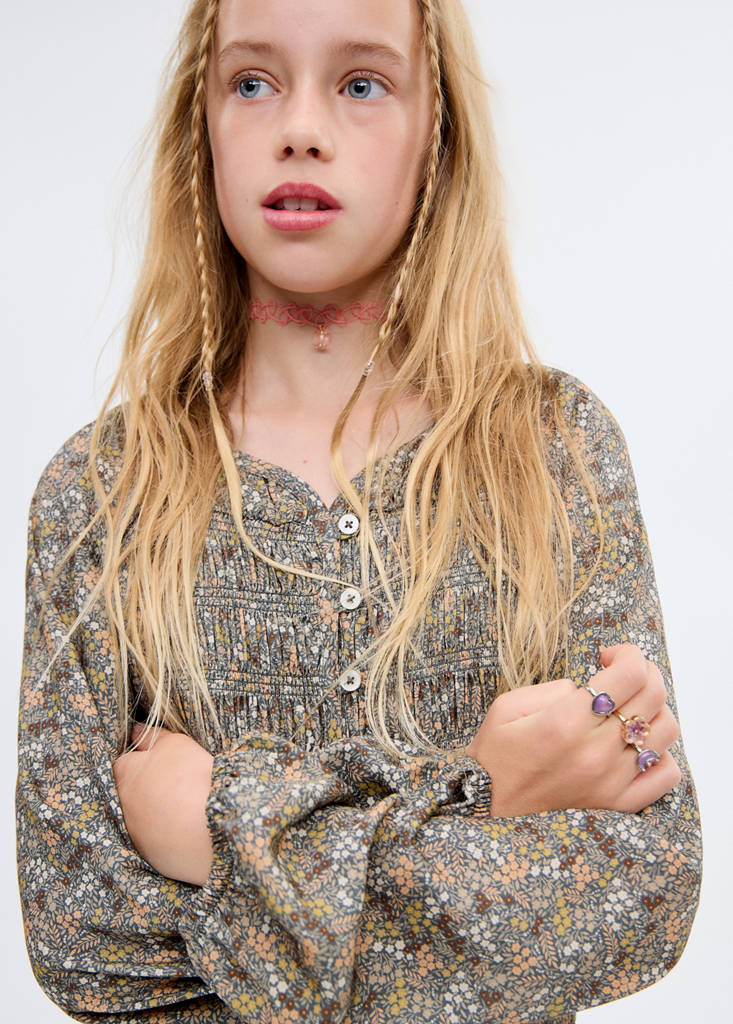 Fluid fabric. Viscose fabric. A-line design. Short design. Round neck. Front closure with buttons. Gathered detail. Honeycomb pattern. Long sleeves with ribbed trims. Gathered panel at the waist