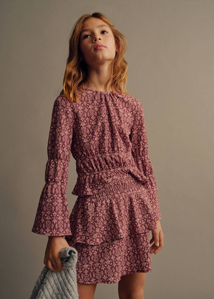 Short design. Print. Ruffled design. Ruched panel. Elasticated waistband. No Fastening