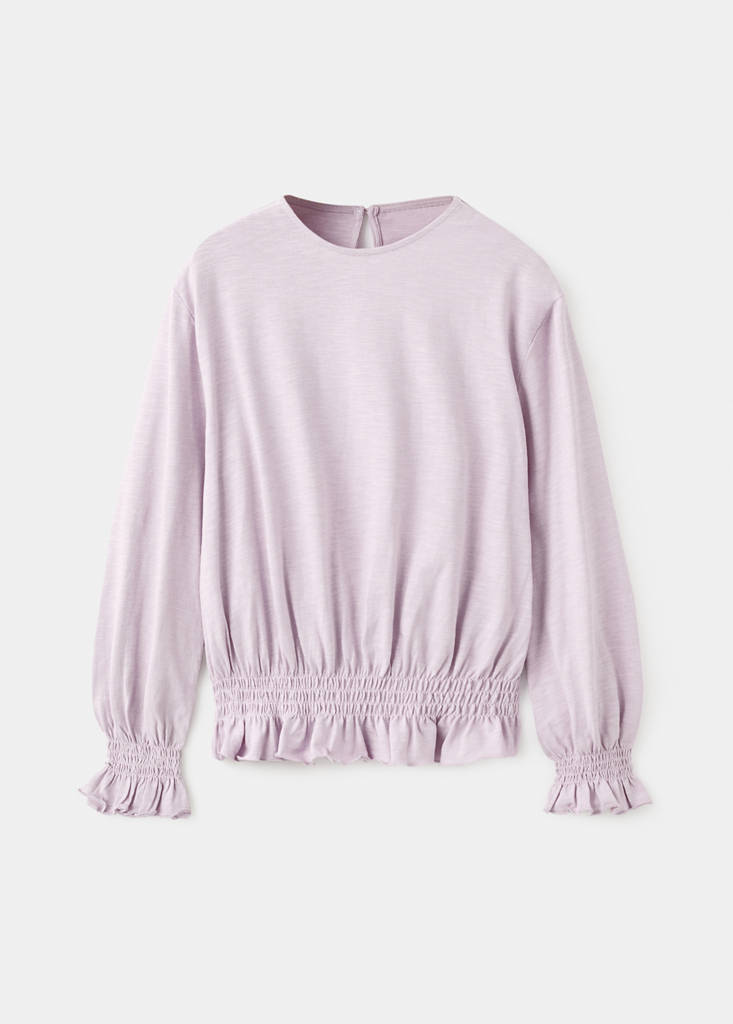 100% cotton fabric. Straight design. Round neck with button closure. Long sleeves with ribbed trims. Elastic gathered hem