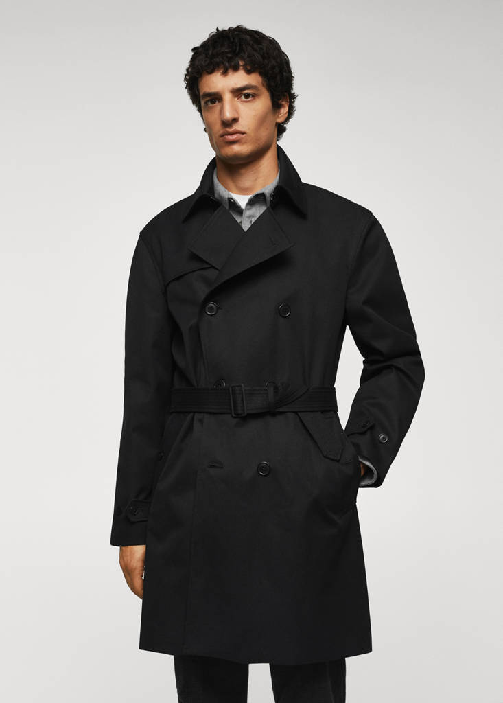 Basics Collection. Cotton-blend fabric. Water-repellent: The durable finish of this garment protects against light rain, repelling contact with water and raindrops. Medium design. Loops on the shoulders. Lapel with notch. Long sleeve. Loops on the cuffs. Two side pockets. Loops on the waist. Removable belt at the waist. Double button fastening. Inner lining. Inner pocket. The model is wearing a size M