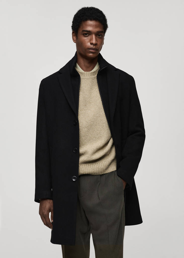 The colour black is exclusively online. Wool mix fabric. Breastplate with removable chimney collar. Three-button front closure. Notched lapel collar. Buttoned cuffs. Opening in the central part of the hem