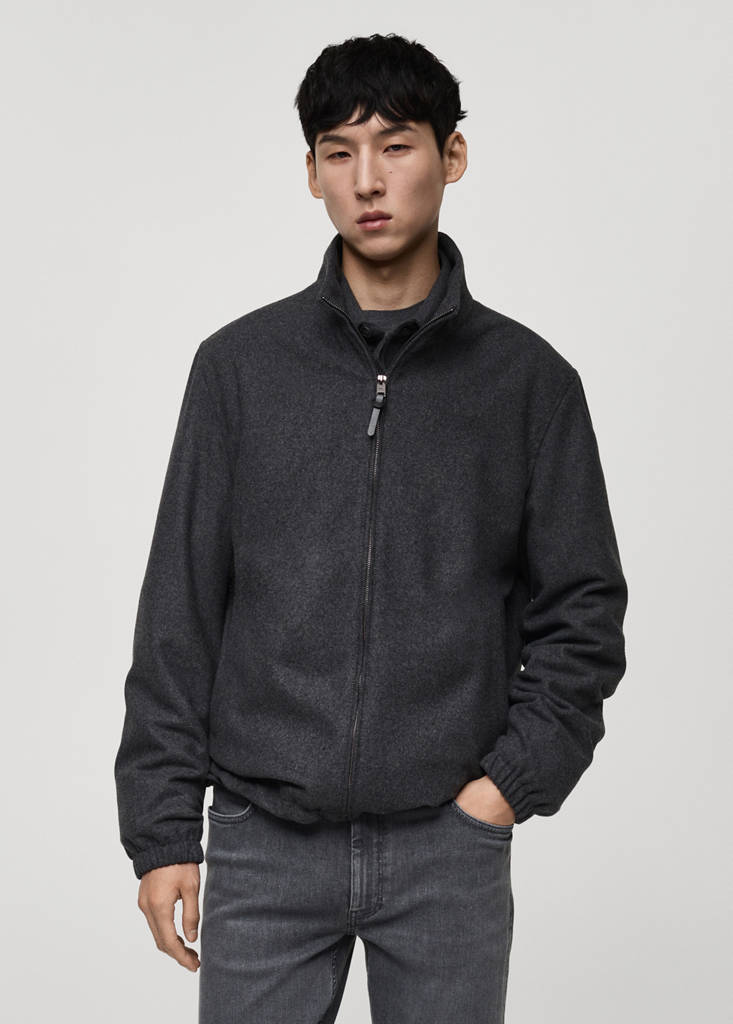 ESSENTIALS: Made to last. Wool fabric. Funnel neck. Front zip closure. Two side pockets with one press stud fastening. Adjustable hem. Inner lining. Long sleeves with ribbed trims