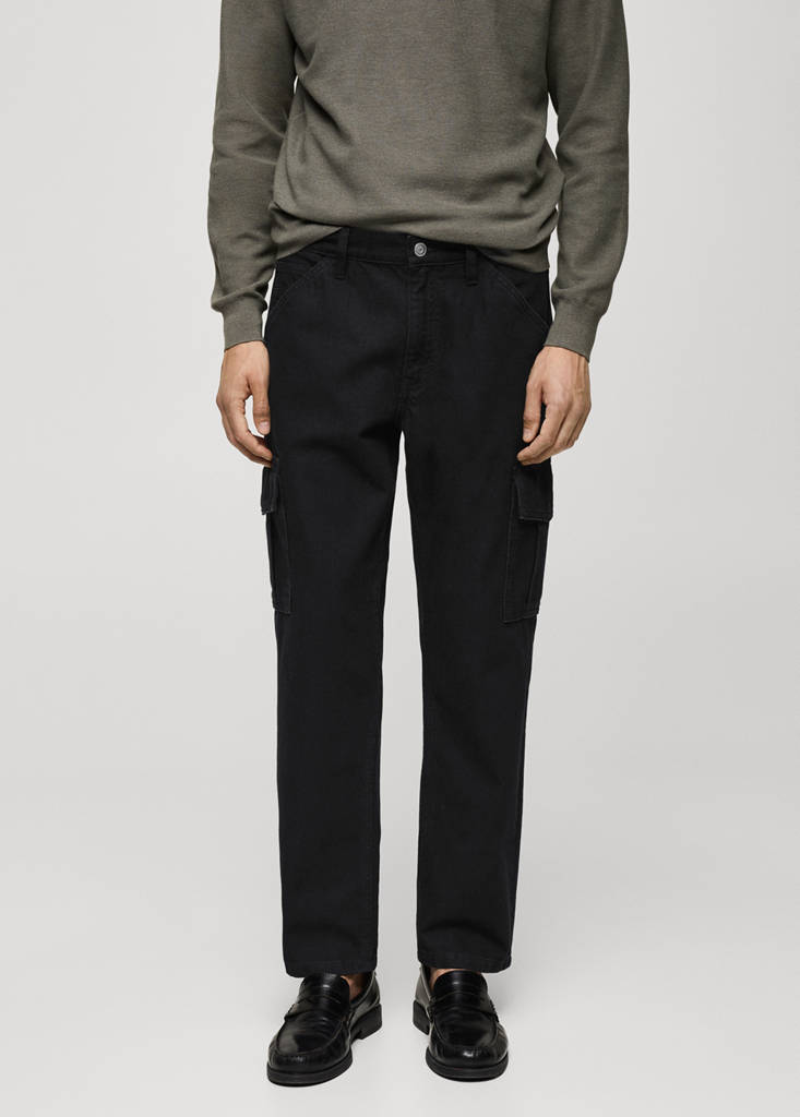 Cargo design. Mid-rise. Zip and button fastening. Belt loops. Two front pockets. Two patch pockets and flap on the leg. Two patch pockets at the back. Straight hem. Straight-fit