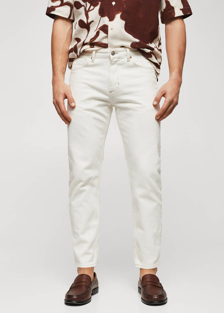 ESSENTIALS: Made to last. Tapered fit: wide cut at the top that narrows from the knee to the ankle. Cropped design. Denim style cotton fabric. Ecru . Zip and one button fastening. Belt loops. Two side pockets. Coin pocket. Two patch pockets on the back. The model is 185 cm tall and is wearing a size 42. Antoine Griezmann Campaign. Denim jeans style