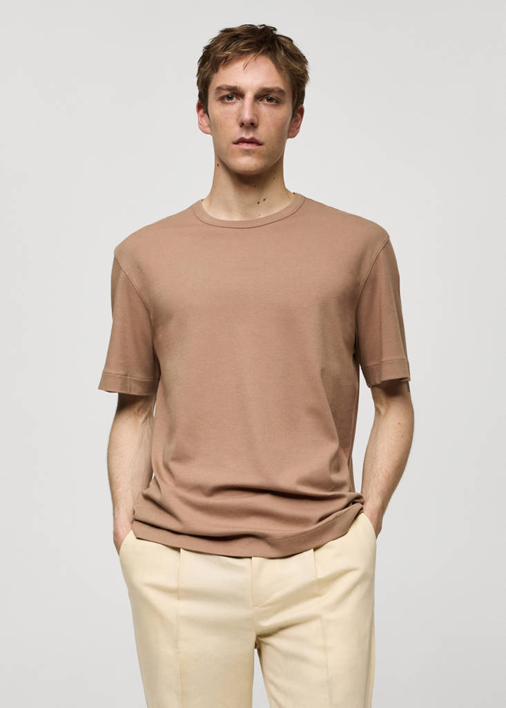 Designed in Italy. Made in Portugal. Plain fabric. Round neck with ribbed finish. Short sleeves with stitched details. Straight hem with side slits. 100% cotton fabric