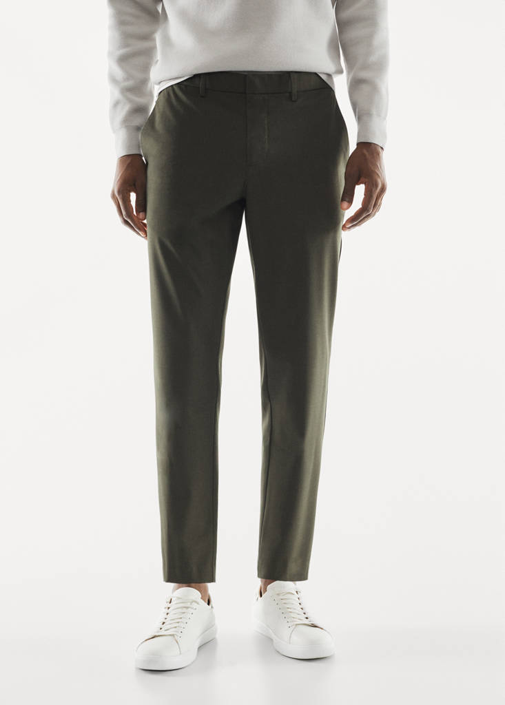 Tapered fit: wide cut at the top that narrows from the knee to the ankle. Cropped design. Stretch fabric. Non-crease. Loops. Drawstring waist. Two side pockets. Two welt pockets on the back. Zip and one button fastening. The model is wearing a size 42