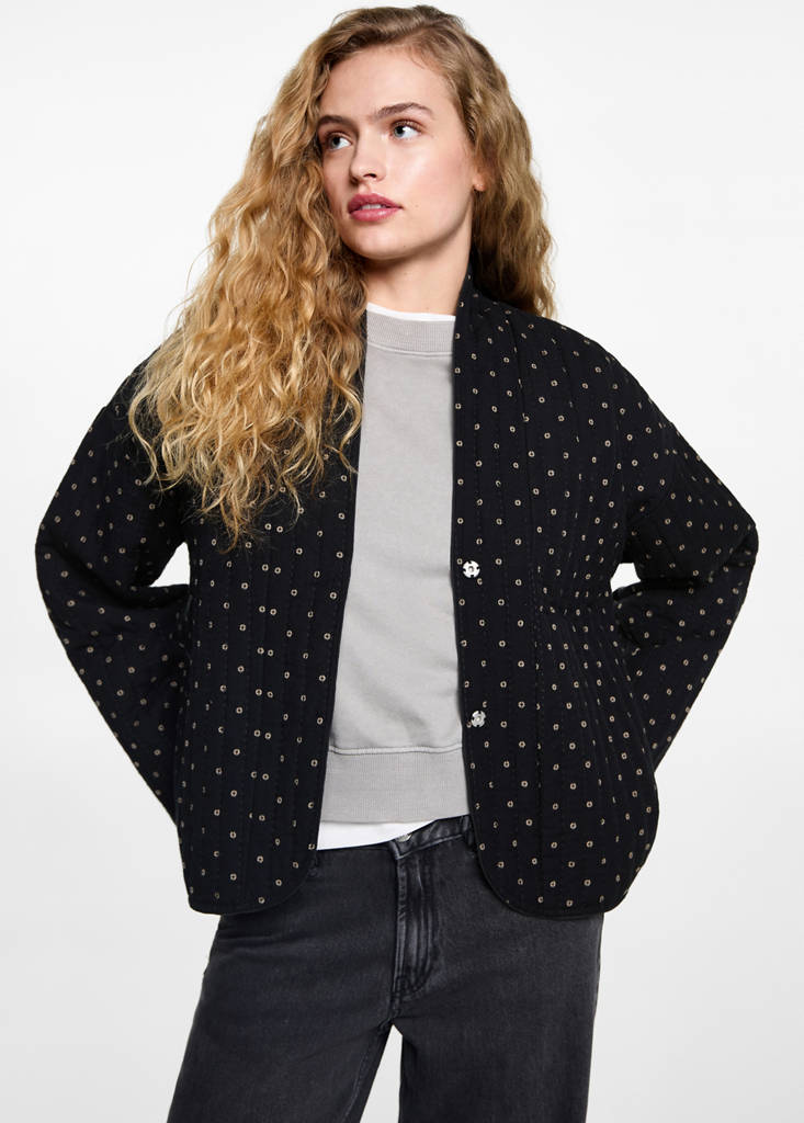 100% cotton fabric. Embroidered fabric. Quilted design. Oversized design. Long sleeves. Front opening. No Fastening