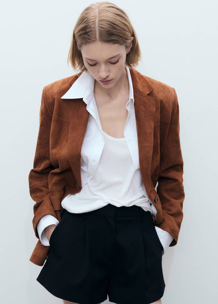 100% goat leather. Straight design. Lapel-collar V-neck collar. Lapel with notch. Long sleeves. Two pockets with flaps on the front. Front closure with buttons. Inner lining