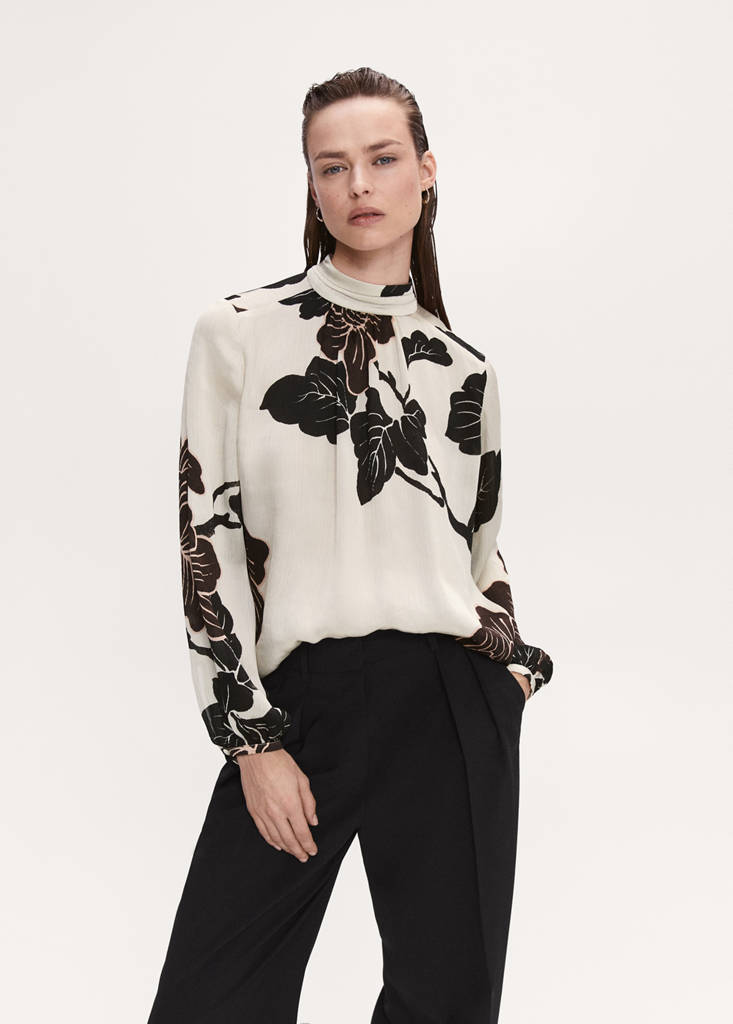 Selection Collection. Gauze fabric. Floral print. Straight design. Turtleneck. Long puffed sleeves. Party and events collection