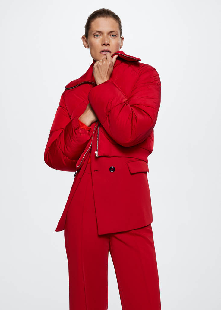 Medium quilted coat. 100% recycled polyester filling. Quilted design. Short design. High neck. Long sleeves. Two side pockets. Zip fastening on the front section. Cable knit finish. Inner lining. Water-repellent: The durable finish of this garment protects against light rain, repelling contact with water and raindrops