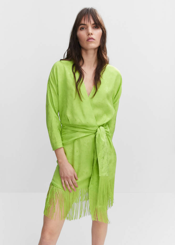 Jacquard. Crossover design. Straight design. Short design. Wrap collar. Long sleeve. Side bow fastening. Fringed panel