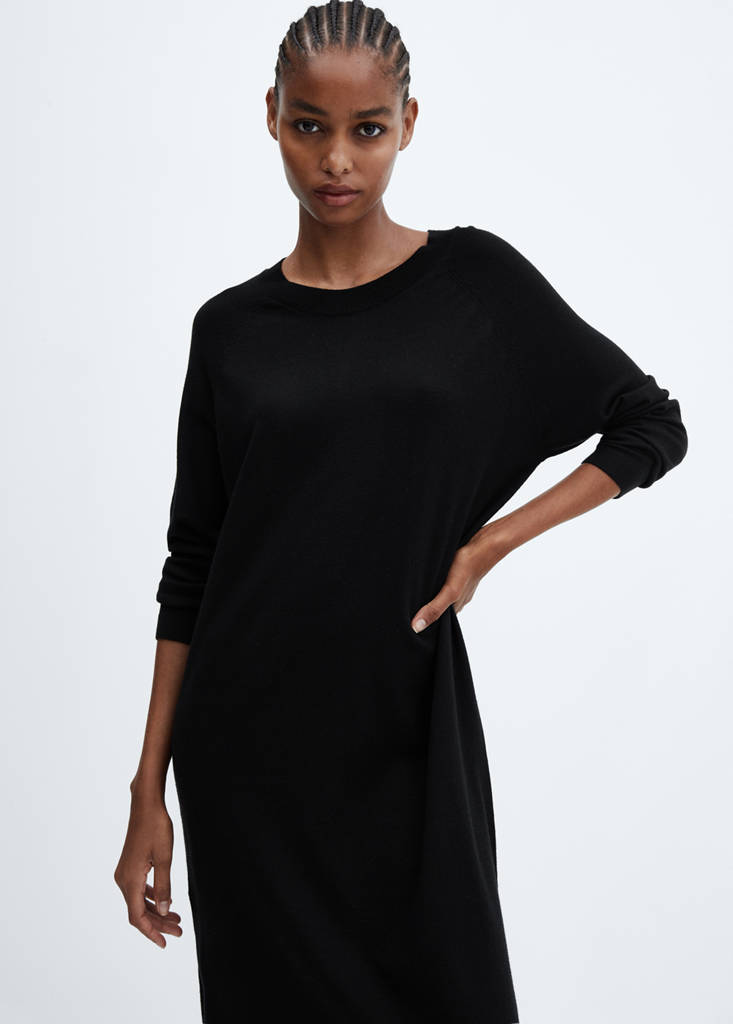 Fine knit fabric. Puffed design. Oversized design. Midi design. High collar. Long sleeves. Hem with side slits. Khaki is an online exclusive. Available Plus