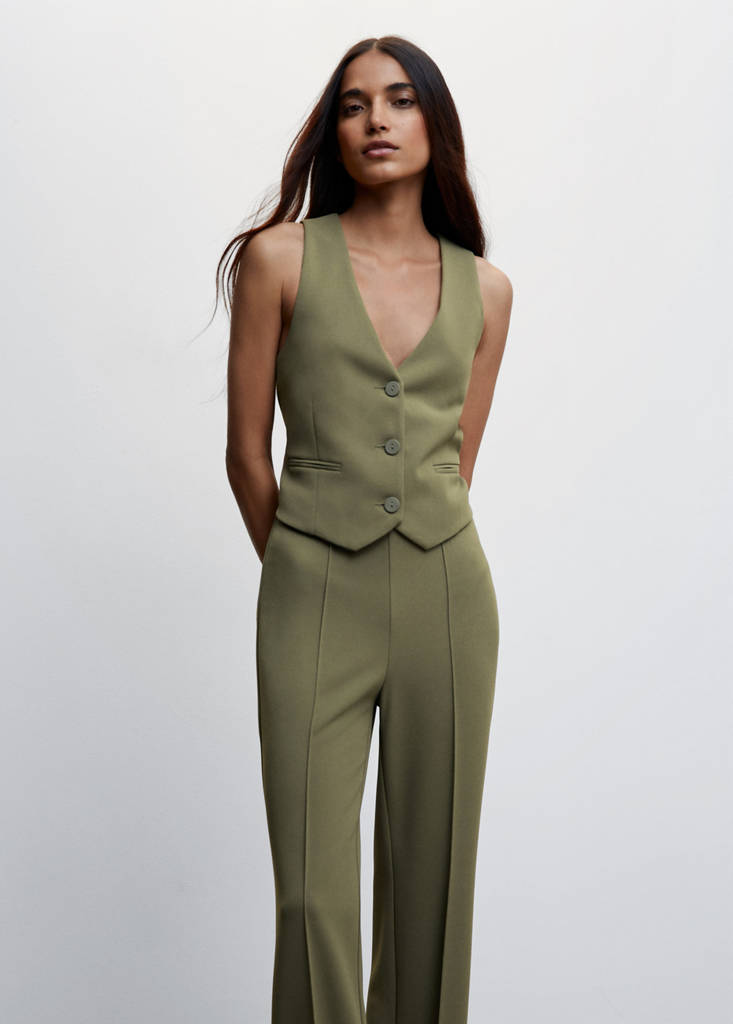 Knitted fabric. Fitted design. Short design. Suit style. V-neck. Sleeveless. Decorative pockets. Button fastening on the front section. Inner lining. Party and events collection. Festival Season