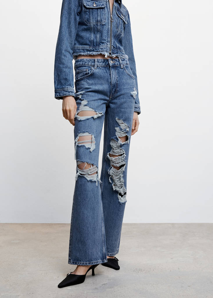 Denim style cotton fabric. Straight design. Long design. High waist. Decorative rips. Zip and one button fastening. Five pockets. Loops. Inseam 83 cm . Festival Season