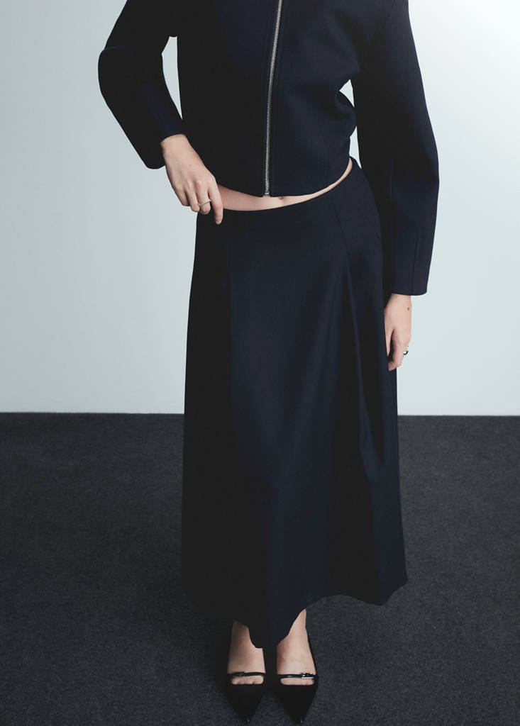 Fluid fabric. Long design. A-line design. Two side pockets. Zip and hook fastening. Dart detail. Total look