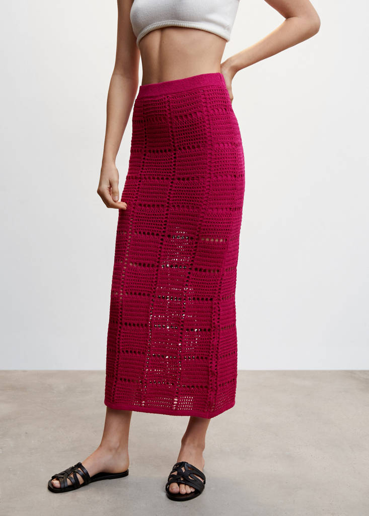 Cotton-blend fabric. Crochet fabric. Medium knit. Midi design. Straight design. Elastic waist. Inner lining. Festival Season