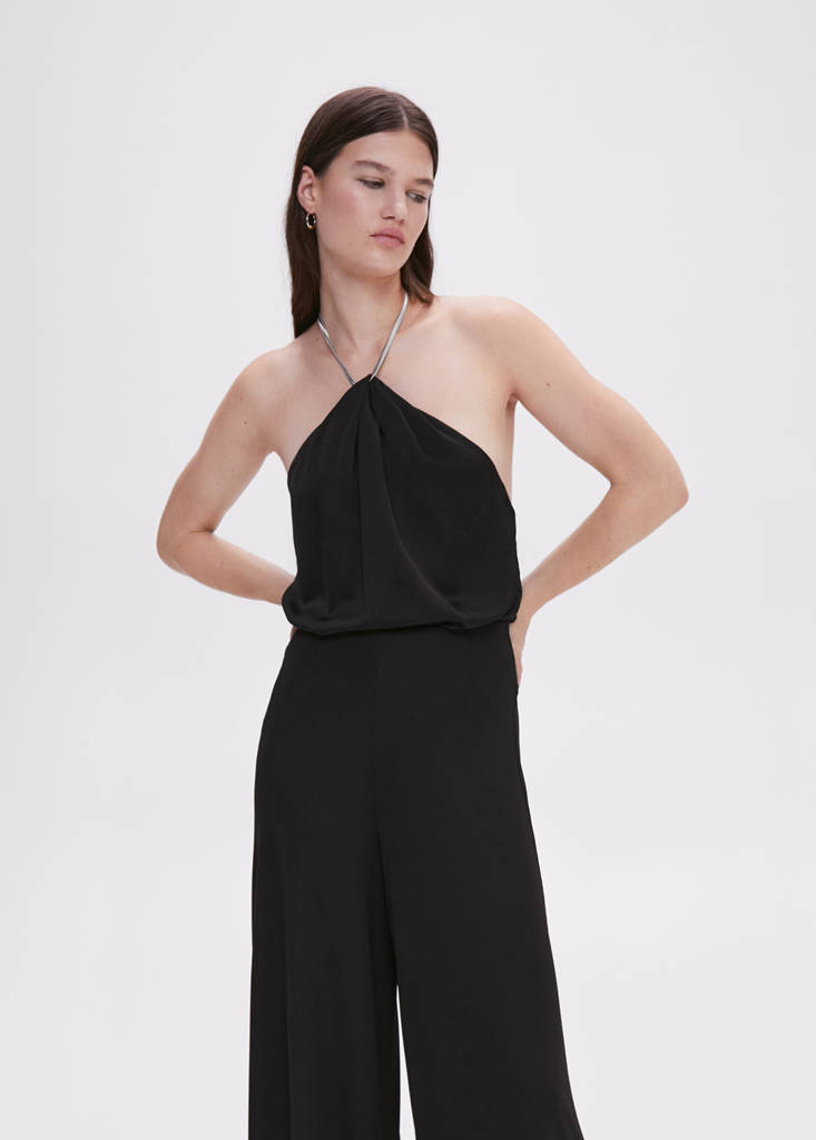 Selection Collection. Flowy fabric. Satin. Straight design. Shaved design. Halter neck. Sleeveless. Open back. Zip and carabiner fastening. The ecru colour is an online exclusive. Party and events collection