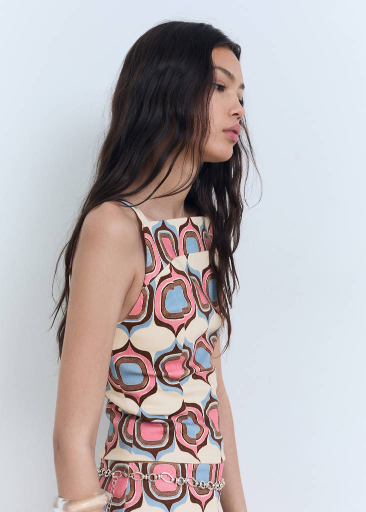 Cotton fabric. Straight design. Geometric print. Boat neckline. Sleeveless. Wide straps. Back zip fastening. Total look