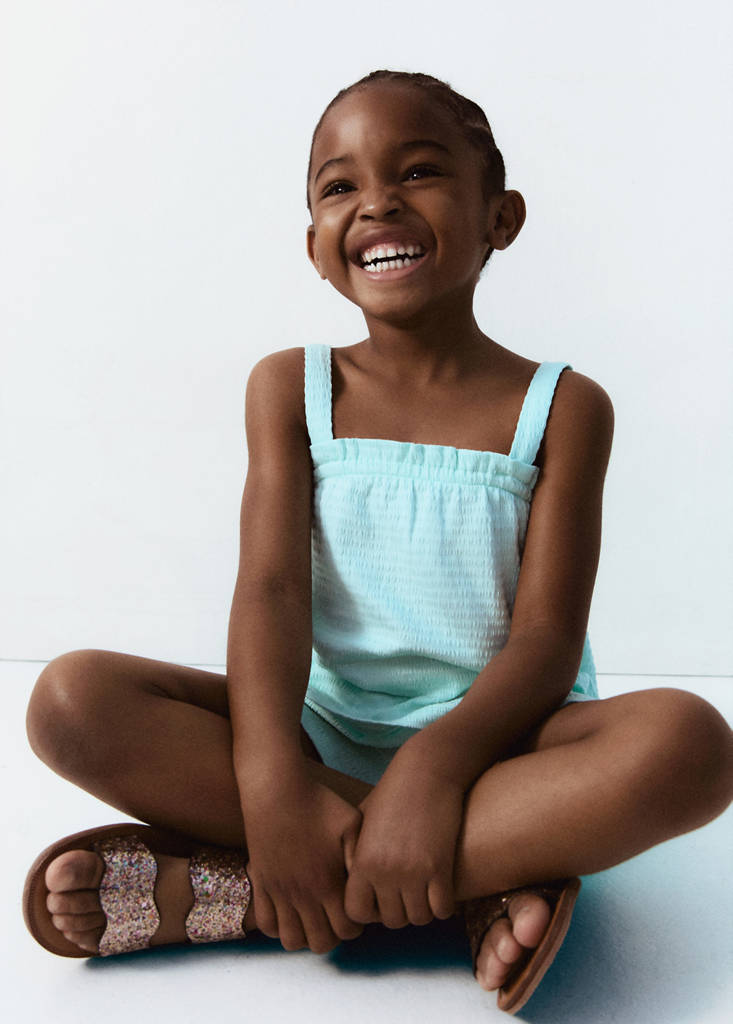 Bomullstyg. Rak design. Kort design. Tunna axelband. Panel med bikakemönster. Volangkant. Fyrkantig halsringning. Ärmlös. Total look