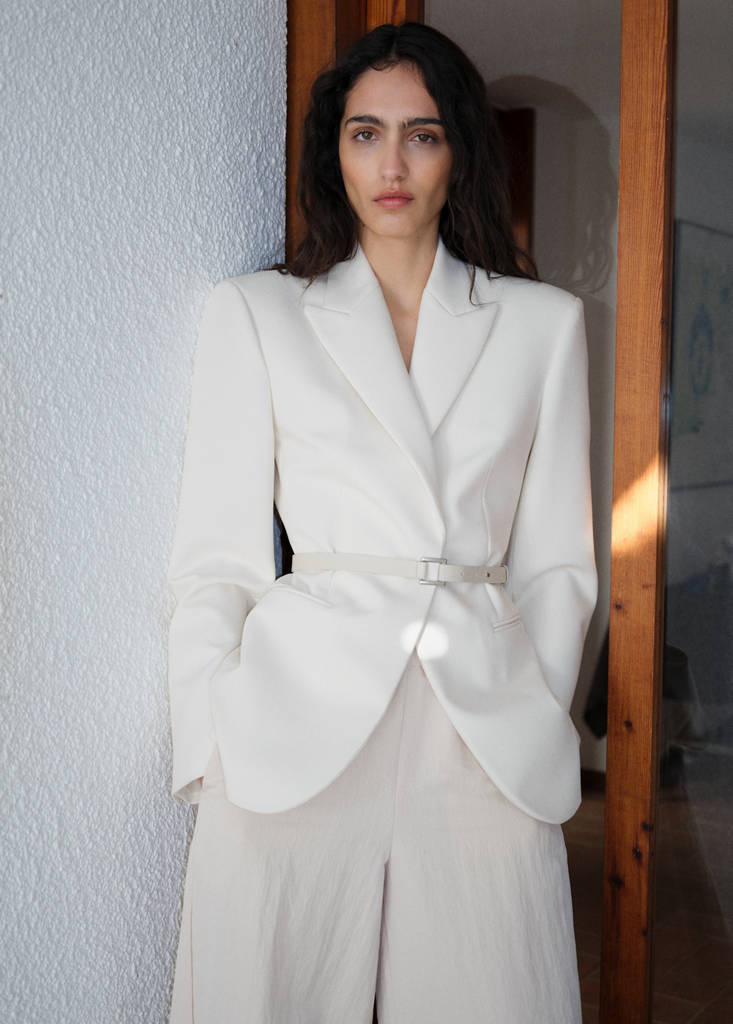 Strukturerad design. Rak design. Markerade axlar. V-ringning med slag. Långärmad med knäppta manschetter. Avtagbart bälte. Två framfickor med kant. Skärp med spänne. Innerfoder