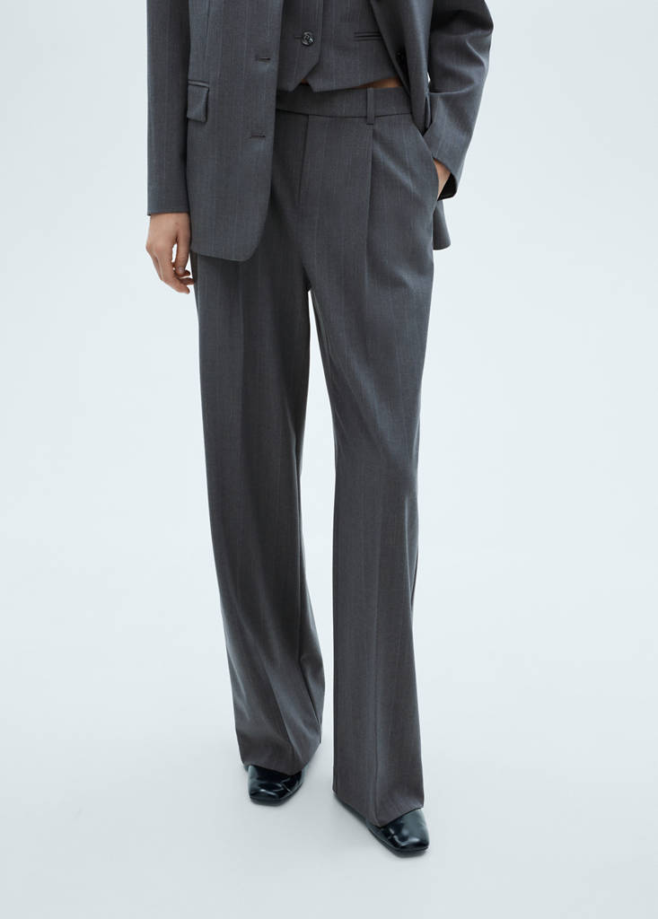 Kritstrecksrandigt mönster. Kostymstil. Rak design. Lång design. Medelhög midja. Bältesöglor. Dold knapp stängning, hake och blixtlås. Två sidofickor. Pincett. Total look. Tillgänglig Plus